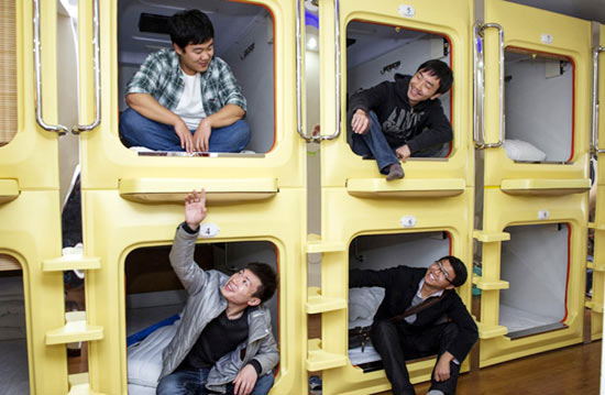 Tourists in the first capsule hotel in Southwest China's Chongqing municipality chat with fellow guests on Nov 22, 2012.