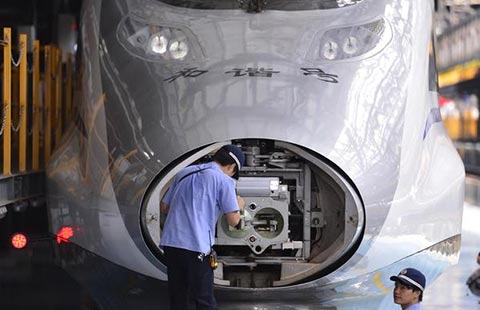 A technician examines the bullet train CRH 380A in Nanchang, capital of East China's Jiangxi province, May 15, 2014. The Hangzhou-Nanchang-Changsha High Speed Railway will open to traffic this September. Two CRH 380A will be put into service on this route. [Photo/Xinhua] |