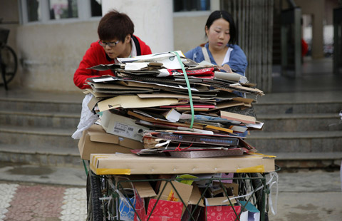 Visitors at Lenovo Group's booth look at the company's products at a trade show in Beijing in March. Provided to China Daily |
