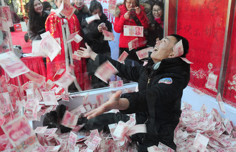 Sun Xiaokai (2nd R) works in Jiaohe Train Station in Jiaohe city, Northeast China's Jilin province, Jan 26, 2016. Young couple Song Mengzhu and Sun Xiaokai, both railway workers of Jilin, are busy working to serve the passengers during the Spring Festival travel rush, which kicked off on Jan 24. Spring Festival, China's most important holiday centering on family reunions, will fall on Feb 8. [Photo/Xinhua]