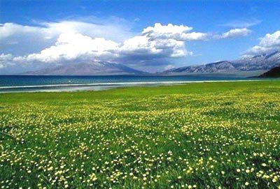 Sailimu Lake, located in Xinjiang Uygurs Autonomous Region is a fault basin at an elevation of 2,073 meters. It means "Lake on the mountain" in Mongolian language. Spring and summer are two best seasons visiting sailumu as flowers blossom.[scol.com.cn]