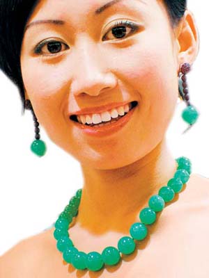 A model shows a valuable jade necklace and earrings at a shop in Jinan, East China's Shandong Province, November 1, 2006. The necklace, made of 29 jade pearls, is said to be valued at 60 million yuan (US$7.7 million). [Photo: Newsphoto/Xinhua]