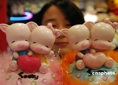 A shop assistant shows toy pigs at a store on Yangzhou, Jiangsu Province, Monday, Dec. 4, 2006. Pig ornaments become popular in China as next year is the Year of the Boar according to the Chinese traditional lunar calendar. [Photo: cnsphoto]