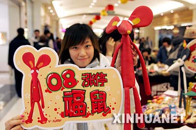 A girl shows her product, a cartoon rat doll, which was handmade for the arts and crafts fair in Beijing on December 30, 2007. The two-day fair displayed various products handmade by local citizens. [Photo:xinhuanet]