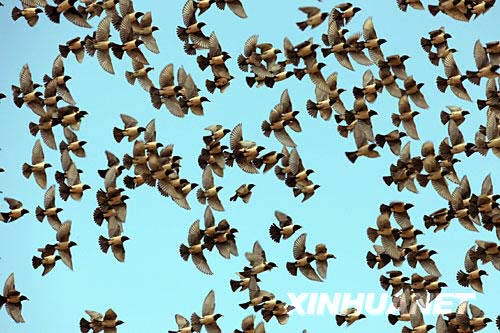 A flock of rosy starlings fly over grasslands in northwest China's Xinjiang Uygur Autonomous Region on June 12, 2008. [Photo: Xinhua] A battle between grasshoppers and rosy starlings is going on this summer on grasslands in northwest China's Xinjiang Uygur Autonomous Region. Rosy starling, a passerine bird feeding on grasshoppers, is under grade two national-level protection. They are now being used on grasslands as bio-pesticides to replace the traditional chemical ones. A rosy starling can eat some 120 to 180 grasshoppers per day. Together with chickens and ducks, the bird contributes a lot to their new habitat. |