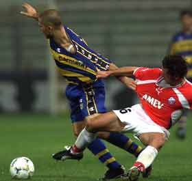 Parma striker Marco Di Vaio (L) fights for the ball with Dutch's FC Utrecht Jean Paul De Jong during their UEFA Cup second round, second leg soccer match in Parma's Tardini stadium November 1. [Reuters]