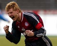 Stefan Effenberg, team captain of FC Bayern Munich, celebrates Munich's second goal during the German first division soccer match against Bayer 04 Leverkusen in Munich's Olympic stadium February 3, 2002. [Reuters]