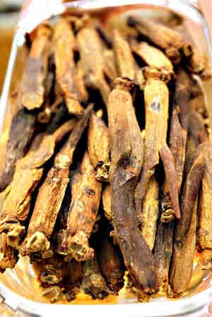 紅參:把鮮參洗凈,剪去小枝根,蒸2~2.5個小時,取出烘干或曬干,制成紅參。紅參又分為兩個種類。其中形態(tài)較好,蘆長、身長、側(cè)根長的是“邊條紅參”。其他的是“普通紅參”。功效:溫補。