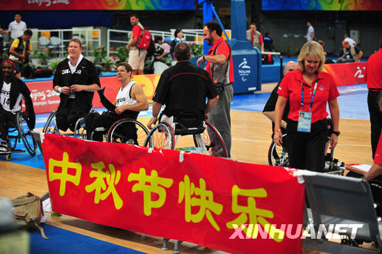 9月14日,加拿大隊球員在北京2008年殘奧會輪椅籃球比賽中打出“中秋節(jié)快樂”的橫幅。新華社記者 李紫恒攝
