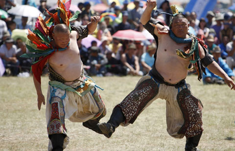 Wrestlers dance during the traditional Nadam Fair in Xinlinhot, Inner Mongolia autonomous region, July 30, 2014. The event attracts around 768 people, including children and women wrestlers in local.