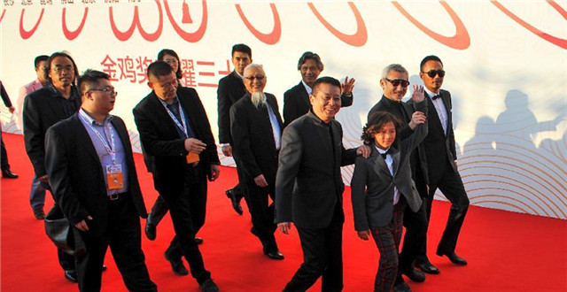 Cast members of the film "The Taking of Tiger Mountain" walk on the red carpet before the Award Ceremony of the 24th China Golden Rooster and Hundred Flowers Film Festival in Jilin, Northeast China's Jilin province, Sept 19, 2015.