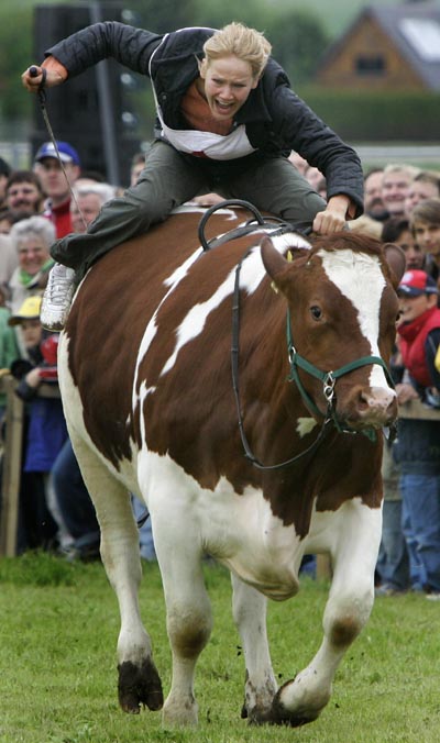 Marianne Grandl rides ox San Diego during the traditional ox race in Oberdolling near the Bavarian town of Ingolstadt May 25, 2006. [Reuters]