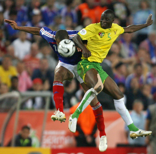 France's Thierry Henry (L) jumps for the ball with Togo's Massamasso Tchangai during their Group G World Cup 2006 soccer match in Cologne June 23, 2006. [Reuters]