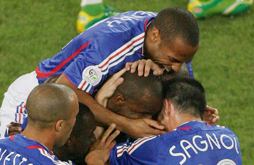 France players celebrate Patrick Vieira's (obscured) goal against Togo during their Group G World Cup 2006 soccer match in Cologne June 23, 2006. [Reuters]