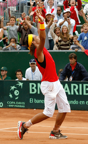 Spain's Rafael Nadal celebrates winning his Davis Cup play-off tennis match against Italy's Filippo Volandri in the northern Spanish town of Santander September 24, 2006. Spain won the play-off against Italy. [Reuters]