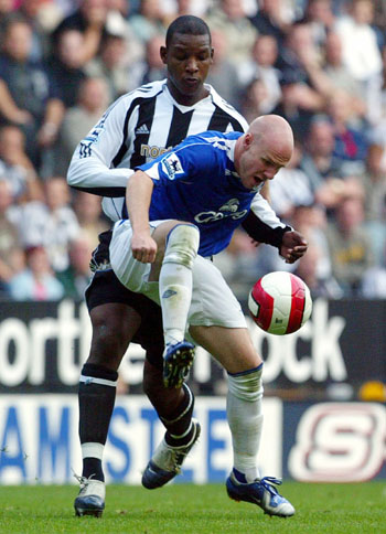 Newcastle United's Titus Bramble (L) tackles Everton's Andy Johnson during their English Premier League soccer match in Newcastle, northern England September 24, 2006. [Reuters]