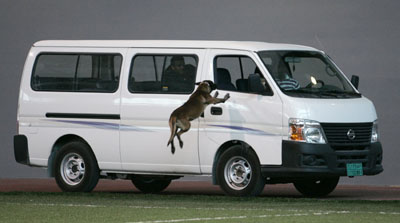 A dog jumps towards a van during a police dog show organised by the Ministry of Interior in association with ASPIRE, the Academy for Sports Excellence, in Doha July 30, 2007.The event took place in the indoor football pitch and included a match between two teams of dogs, which are trained to uncover crime. [Reuters]