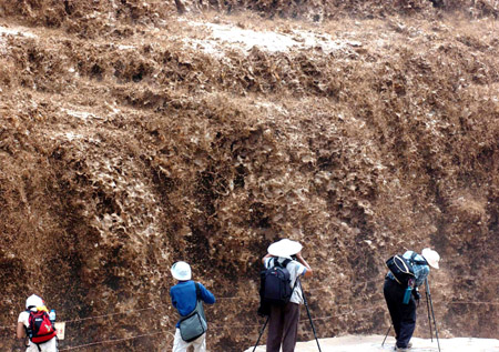 Visitors take photos of the torrential Hukou Waterfall on the Yellow River in Jixian County, North China's Shanxi Province, July 30, 2007. The width of Hukou, the world's only yellow waterfall, reached 100 meters after days of continuous rainfalls on the upper reaches of the Yellow River. [Xinhua]