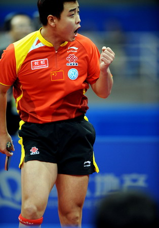 China's Wang Hao reacts after winning a point over South Korea's Lee Jung-woo during the men's final of the World Team Table Tennis Championships in the southern Chinese city of Guangzhou March 2, 2008. Wang is also awarded as Male Player of the World Team Table Tennis Championships. [Xinhua]