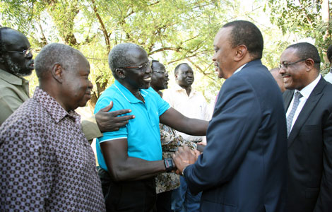 Ethiopian Prime Minister Hailemariam Desalegn (left), South Sudanese President Salva Kiir (middle) and Kenyan President Uhuru Kenyatta hold a meeting at State House in Juba, South Sudan, Dec 26, 2013. The leaders of Kenya and Ethiopia arrived in South Sudan to mediate and solve the crisis the country is facing. [Photo/Icpress.cn]