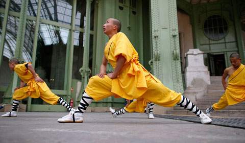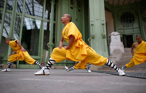 Shaolin martial arts students attend a rehearsal of "Nuit de Chine" (Night of China) event at the Grand Palais in Paris, January 26, 2014. This event will run on January 27 and commemorates the 50th anniversary of the establishment of diplomatic relations between France and China. [Photo/Agencies] |