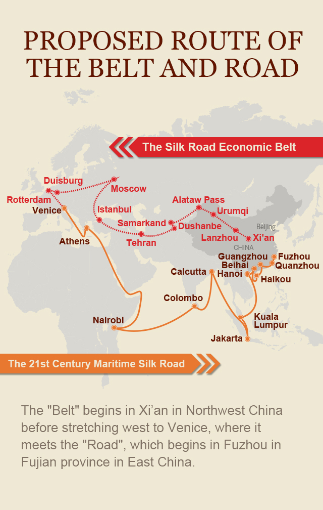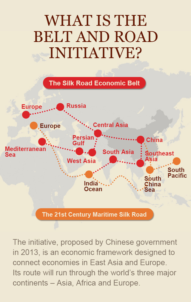 The Belt and Road Initiative, proposed by Chinese government in 2013, is an economic framework designed to connect economies in East Asia and Europe. Its route will run through the world’s three major continents—Asia, Africa and Europe.