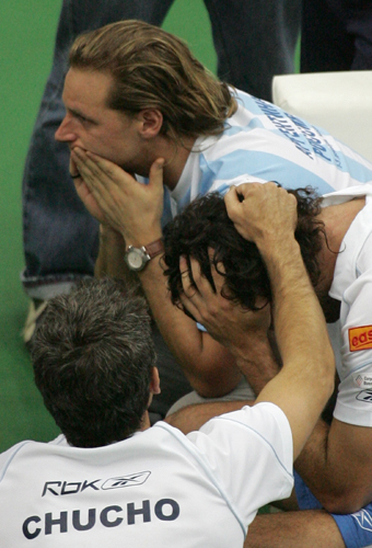 Argentina's Jose Acasuso (C) and David Nalbandian (top) react after Argentina lost against Russia at the Davis Cup tennis final in Moscow December 3, 2006. [Reuters]