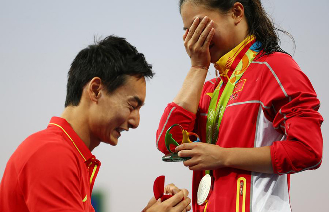 Silver medalist He Zi of China (R) receives a marriage proposal from teammate Qin Kai after the medal ceremony of the women's 3 meter springboard at the Rio Olympics on Sunday. Qin won the men's 3 meter synchronized 3m springboard on August 10.